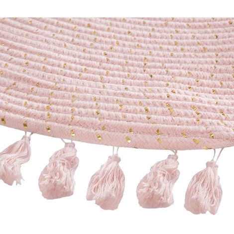 Apportez une touche de folie rose dans votre intérieur avec ce magnifique tapis circulaire à franges avec Lurex doré. Tendance rose bonbon et dorure, ce beau tapis de diamètre 90 cm en coton et polyester trouvera sa place dans la chambre de votre fille.