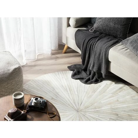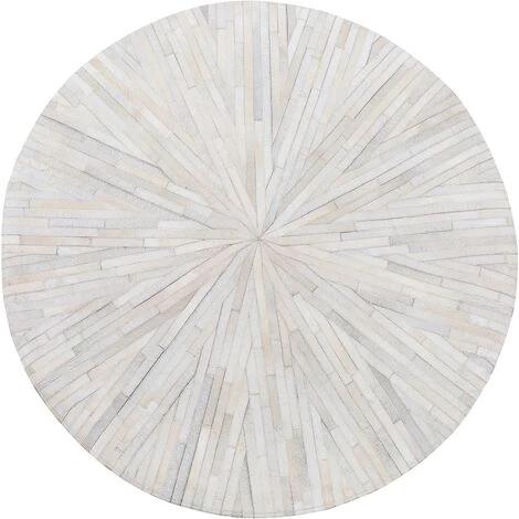 Tapis en cuir rond de couleur blanche. Doux, cosy et chic, ce tapis rond aux couleurs chaudes vous procurera une atmosphère amicale. Les étroites bandes de cuir sont disposées en ligne, émanent de son centre tels des rayons de soleil. Avec ses teintes naturelles, blanches et beiges et son design attrayant, elle s’intègre parfaitement à tous types de pièces et s’accommode particulièrement bien sous une table ronde ou une table basse. Le tapis de cuir a une face verso en feutre. Les couleurs et les motifs peuvent différer de la photo car chaque tapis est fait à la main.