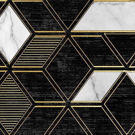 Apportez une touche de modernité à votre salon ou votre chambre à coucher, avec ce tapis. déco. Des motifs géométriques en colori noir et blanc réhausés de lignes dorées sur un fond marbré. donnera du cachet à votre interieur. . Celui-ci deviendra la pièce maîtresse de votre déco. Ce tapis est une collection lavable en machine à 30°. . Caractéristiques:. Dimensions : 50 x 80 cm, 80 x 150 cm, 120 x 160 cm et 160 x 230 cm . Coloris : noir. Composition: 100% polyester imprimé. Finition : trame en coton , anti dérapant – dos en cuir. . Vendu à l’unité