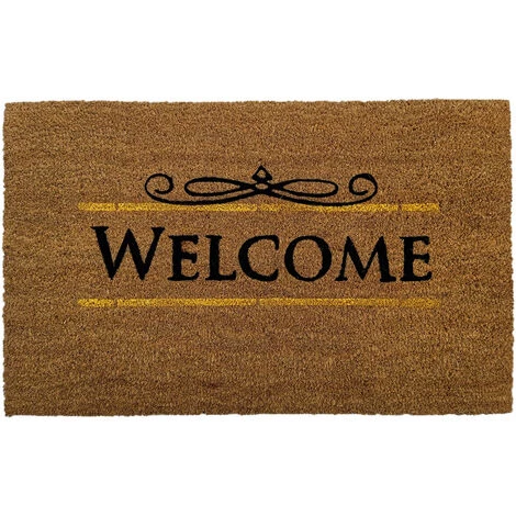 Ce joli tapis en noix de coco ajoute une atmosphère chaleureuse à votre entrée. L’imprimé « Welcome » est combinée avec deux ignes jaunes et une élégante ligne noire pour un look luxueux. Le paillasson en fibre de coco n’est pas seulement un bel accroche-regard pour votre intérieur, il a aussi un effet nettoyant.