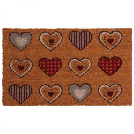 Paillasson en coco, 12 coeurs rouges et blancs. Envers latexé.Matière : coco