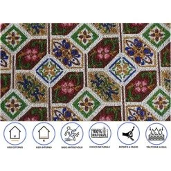 Baroni Home Paillasson De Noix De Coco Peinte à La Main à La Main à La Main En Plein Air, Style Sicilien 70×40 Cm Facile à Nettoyer Et Super Résistant. Tuiles Vertes Et Brunes