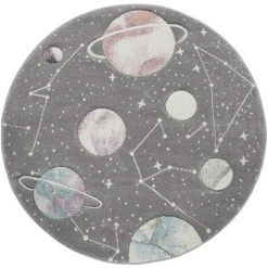 Paco Home Tapis Pour Enfants, Tapis De Jeux Planètes Et Étoiles, Chambre D’Enfant Gris Ø 120 Cm Rond