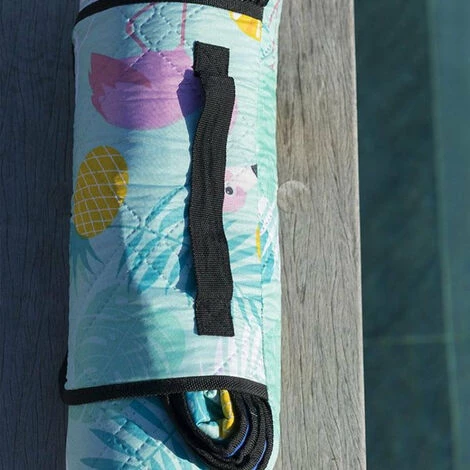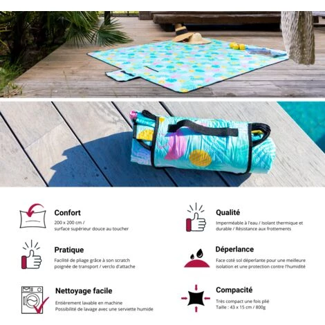 - CARACTÉRISTIQUES : matériel : dessus en polycoton 190 fils, rembourrage mousse polyester 80g, dessous oxford polyester 210D / taille déplié : 200 x 200 cm / taille plié : 43 x 15 cm / poids : 800g / face coté sol déperlante pour une meilleure isolation et une protection contre l’humidité / Poignée de transport / velcro d’attache / résistance au frottement. / également disponible avec d’autres motifs.