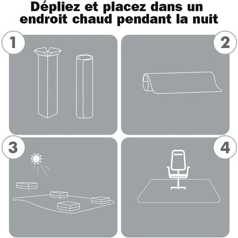 - Veuillez noter que le matériau en PE peut prendre quelques heures avant de retrouver sa forme d’origine. S’il vous plaît dépliez et placez dans un endroit chaud pendant la nuit pour permettre au tapis de se mettre en place avant utilisation, cela peut prendre plus de temps pendant la saison froide